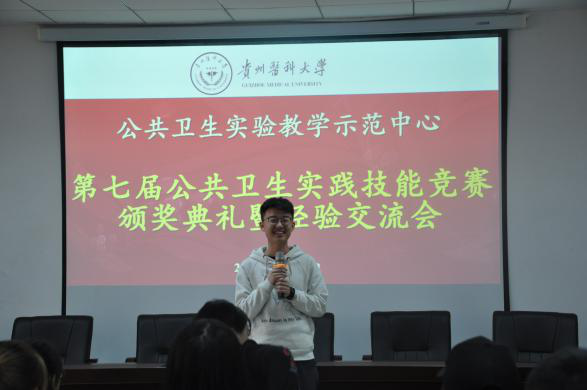 随后,部分优秀选手进行了技能竞赛的经验交流。一等奖获得者,2018级劳动卫生与环境卫生学硕士研究生欧阳湖同学,与大家分享了此次竞赛获奖的经验、参加广东省公共卫生技能竞赛的体会,分析了公司员工的优势与不足,希望学弟学妹们在加强技能训练的同时要夯实理论基础,在案例分析中要学会理论的灵活运用以及与实践的有机结合,力争在今后的竞技中取得更好的成绩。2016级预防医学专业袁恺宏同学用PPT展示了全国首届公共卫生实践技能大赛的比赛现场,与大家分享了国家级公共卫生综合技能大赛的观摩体会。