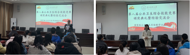 随后,部分优秀选手进行了技能竞赛的经验交流。一等奖获得者,2015级预防医学专业牟佳龄同学与大家分享了此次竞赛的心得体会,她用“为什么要参赛?”、“参赛需要准备什么?”、“参赛意义是什么?”三个问题对本次竞赛进行了剖析,表示“公共卫生综合技能竞赛”是公卫人将理论应用于实践的一个很好的练兵场,而扎实的基础理论知识则是实践应用的前提;2016级预防医学专业张露文同学表示本次竞赛最大的收获不仅是实践技能的提升,还深刻认识到了比赛中团队协作和面对问题时沉着冷静思考的重要性。最后参赛同学纷纷发表了个人意见和建议,为公共卫生技能竞赛越办越好建言献策。
