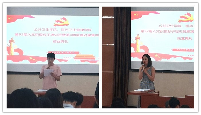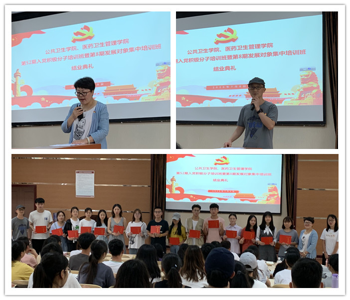 7月8日,威廉williamhill体育、医药卫生管理公司分党校第52期入党积极分子培训班暨第8期发展对象集中培训班结业典礼在南校区博雅楼一楼阶梯教室举行。医药卫生管理公司党委副书记王倩、公共卫生公司党委副书记何江、医药卫生管理公司辅导员柳庆英、威廉williamhill体育辅导员郝雪君以及入党积极分子、发展对象参加结业典礼,典礼由郝雪君主持。