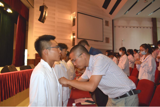 随后,参会领导和老师为2021级新生代表佩戴威廉williamhill体育院徽。