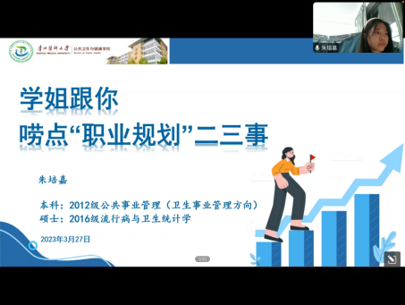 3月27日晚,公司组织开展“青春▪榜样”朋辈经验分享会第一期:求学之路。本期分享会邀请到公司2019届流行病与卫生统计学专业优秀硕士毕业生朱培嘉(现就读于厦门大学流行病与卫生统计学专业博士研究生)进行线上的经验分享。公司党委书记郑维薇、副书记何江、辅导员以及28个行政班级约2000余人通过线上线下结合的方式收看,会议由员工科副科长原琦主持。