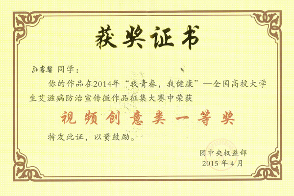 “我青春 我健康”——全国高校老员工艾滋病防治宣传微作品征集大赛表彰活动在厦门举行,公司2014级预防医学专业孙睿馨同学的作品《幸福之路》,荣获全国“视频创意类一等奖”。